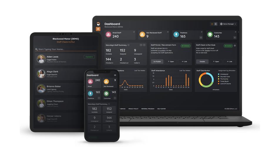 Recruit, schedule, and communicate with your actors and staff using Sithon — the industry-leading platform trusted by professional haunted attractions, founded by an industry veteran.